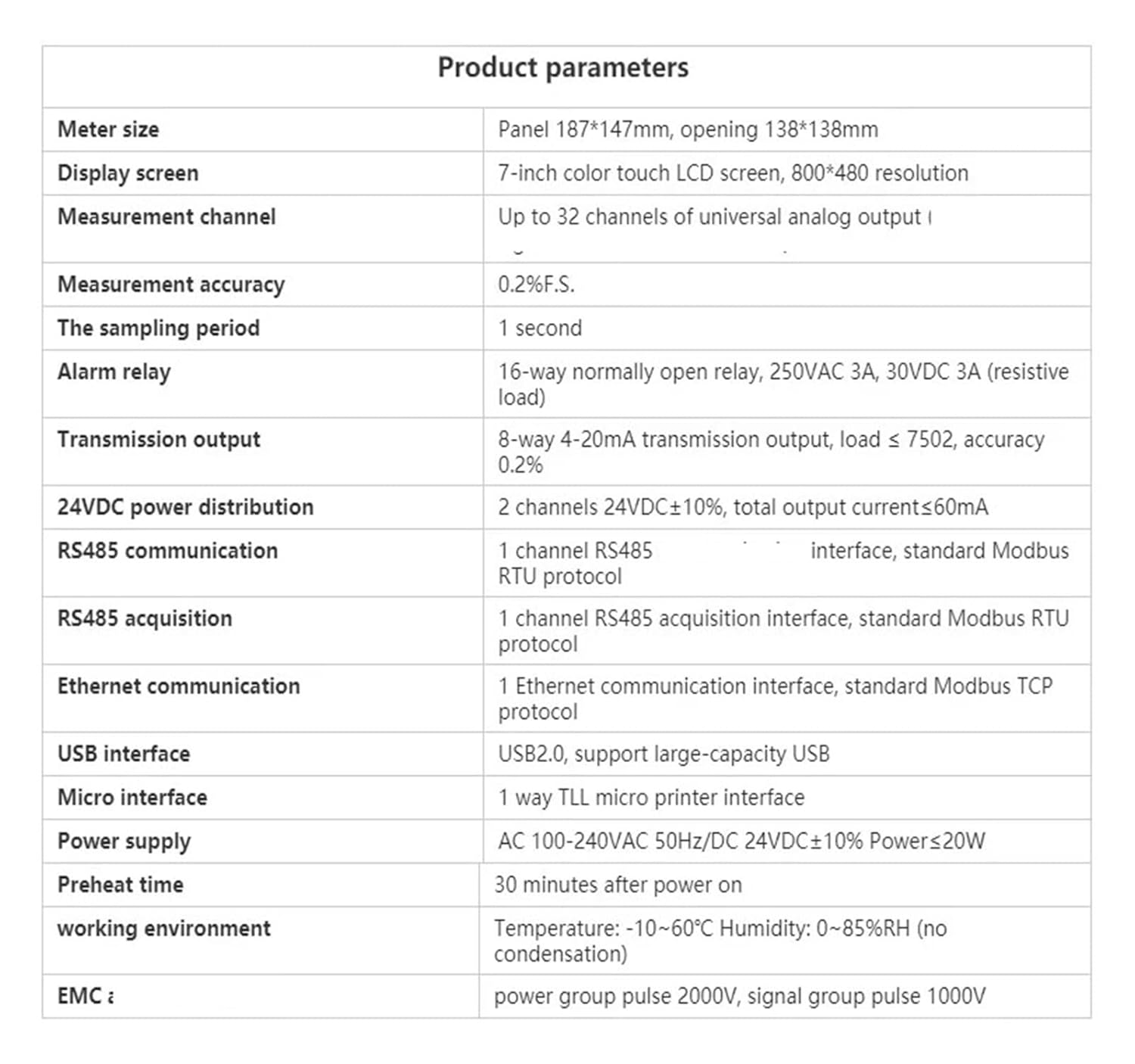 Usage: Industrial Display size: 7 inches and up Power supply: 220 VAC Input channels: max. 32 channels Transfer data: USB Protection function: power off protection. Net Weight: 2kg Output: RS485 Optional