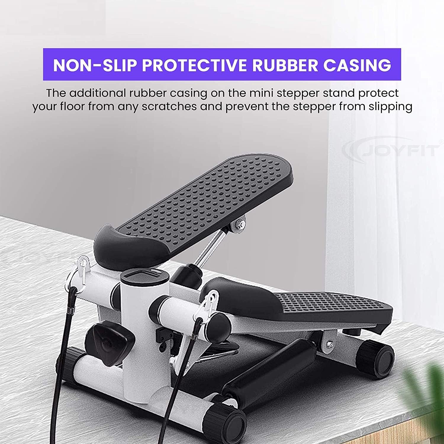 ABS Mini Stepper for Cardio, Strength Training - Adjustable Step Exercise Machine with Display Monitor and Resistance Bands for Men & Women The LED digital display Mini Stepper will display Time elapsed, Calories burned, Number of steps per minute, and Total number of steps on your workouts. Through the convenient scan mode of LCD Display, you will be tracking your workout progress with great ease and this process motivates you to achieve all your fitness goals. Stepper works on Hydraulic Drive mechanism, which provides smooth stepping movement and ensures even pedal resistance during exercise. Mini Stepper is made of Heavy Duty steel which enhances overall durability of the equipment and foot pedals are made of ABS material with anti-slip embossment that ensures safe grip during vigorous workouts.