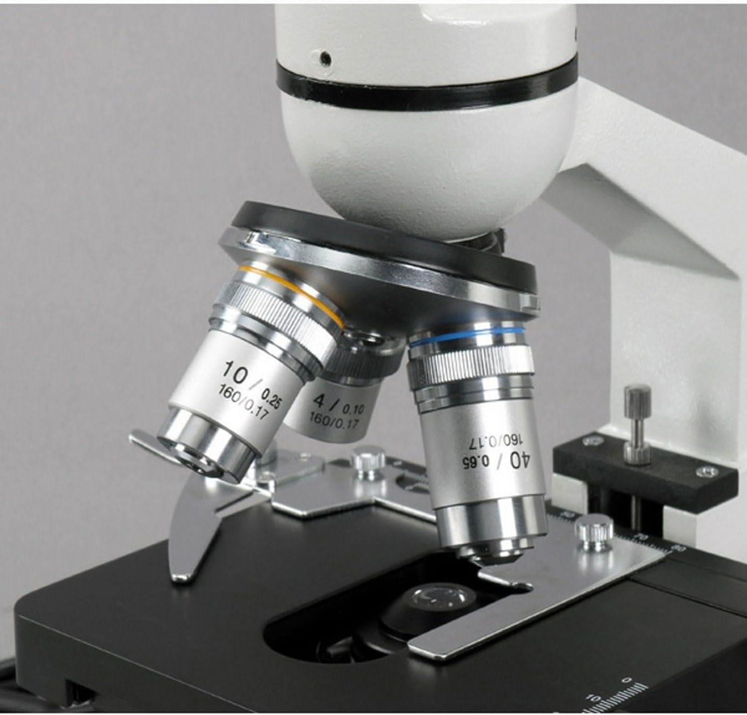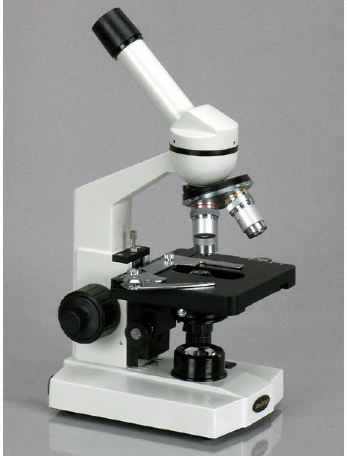 The AmScope M220A monocular compound microscope has interchangeable 10x widefield and 16x widefield eyepieces, a forward-facing nosepiece with three DIN achromatic objectives, tungsten illumination, coaxial nested coarse and fine focus, a 1.25 NA Abbe condenser, and a mechanical stage. The monocular viewing head has a fixed 45-degree vertical inclination to reduce eye and neck strain, and 360-degree rotation capability to enable sharing. The forward-facing revolving nosepiece has 4x, 10x, and 40xS DIN achromatic objectives that provide color correction of magnified images. The 40xS objective is spring loaded to prevent damage to the slide or objective when focusing. A compound microscope is used for inspection and dissection of specimens when two-dimensional images are desired. The microscope has lower (diascopic) Brightfield illumination that transmits light up through the specimen for enhanced visibility of translucent and transparent objects. Brightfield (BF) illumination allows the specimen to absorb light, resulting in a dark image on a light background. Tungsten (incandescent) illumination provides bright light, and a rheostat controls the amount of light emanating from the lamp. The 1.25 NA Abbe condenser can be adjusted to control the distance of the light from the stage and has an iris diaphragm to optimize the amount of light illuminating the specimen. The mechanical stage, with 1mm stage divisions, locks the slide into place and provides precise slide manipulation along the X- and Y-axis to allow coordinates to be recorded, enabling the viewer to return to a specific location on the slide. The stage is 5 x 4-1/2 inches (W x D), has a focusing range of 13/32" (10mm), and a traveling range of 2-3/4 x 3/4 inches (W x D; where W is width, the horizontal distance from left to right; D is depth, the horizontal distance from front to back). Nested coaxial coarse and fine focus eases focusing for left- and right-handed viewers, and a rack-and-pinion mechanism provides precise and secure focusing. All the mechanical parts of the microscope are constructed of metal to provide durability and resistance to wear. The cast-alloy metal frame has a stain-resistant enamel finish for durability and to ease cleaning. SpecificationsHeadMonocularEyepiecesWF10x, WF16xLenses10x, 20x, 40xS DIN achromaticStageDouble-layer mechanical, with 1mm stage divisionsFocusCoaxial coarse and fineCondenser1.25 NA AbbeLight sourceTungsten with rheostat, 20WDiaphragmIrisIllumination typeBrightfield (BF)Power110VMicroscopes are instruments used to enhance the resolution of an object or image. Types include compound, stereo, or digital. Compound microscopes use a compound optical system with an objective lens and an eyepiece. Stereo microscopes show object depth in a three-dimensional image. Digital microscopes are used to display an image on a monitor, rather than looking through a lens. Microscopes can have monocular (one), binocular (two), or trinocular (three) eyepieces, with varying magnification abilities. Magnification ability refers to the size of an image. Resolution, also known as resolvant power, refers to the clarity of the image. The interaction between field of view (FOV), numerical aperture (NA), and working distance (WD) determines resolution. Microscopes can control magnification through a fixed focus, or through a range of adjustments. They can also utilize LED, fluorescent, and mirror light sources to help control viewing capabilities. Microscopes are widely used in education, lab research, biology, metallurgy, engineering, chemistry, manufacturing, and in the medical, forensic science, and veterinary industries.United Scope manufactures microscopy equipment and accessories under the brand name AmScope. The company, founded in 1996, is headquartered in Irvine, CA.What's in the Box?AmScope M220A microscope with mechanical stageWF10x eyepieceWF16x eyepiece4x DIN achromatic objective10x DIN achromatic objective40xS DIN achromatic objective(2) Stage clipsSpare tungsten bulbSpare fuseDust coverInstructions