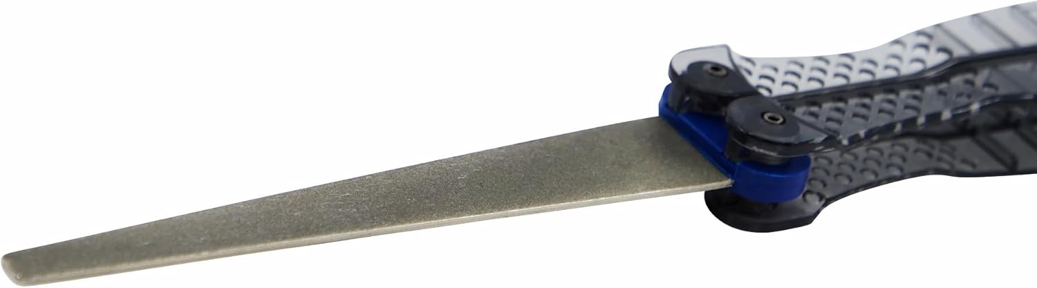 Product Description DMT FFF Diafold Diamond Flat Folding File Fine From the Manufacturer For confined, narrow applications, reach for DMT Diafold Flat File. Only 1/16-inch thick, diamond surface on one side, tapers from the base 3/4-inch to 1/4-inch. Fine diamond (25 micron / 600 mesh) for a razor sharp edge. Convenient size: 9 1/2-inch open. 5-inch closed. Folding plastic handles protect file when not in use. Hones in a fraction of the time required by conventional files. No messy oils needed—use dry or with water. Durable construction will provide years of consistent performance and reliable service For proper tool maintenance, woodworkers, chefs and other professionals rely on the superior quality and versatility of DMT products. Made in USA.