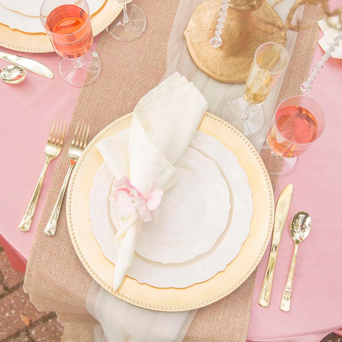 Made with high quality strong durable plastic Disposable Upscale elegant look Great substitute for china Saves time and effort for easy clean up, just throw them away after Uses: Family gatherings Holiday parties Events Bridal showers Baby showers Birthdays Anniversaries Weddings & more Whether you're using these party plates for family gatherings, parties, or any special occasion, the right quality plastic dinner plates can make all the difference when it comes to impressing your guests. That’s why we put together this gorgeous elegant plastic plates set.
