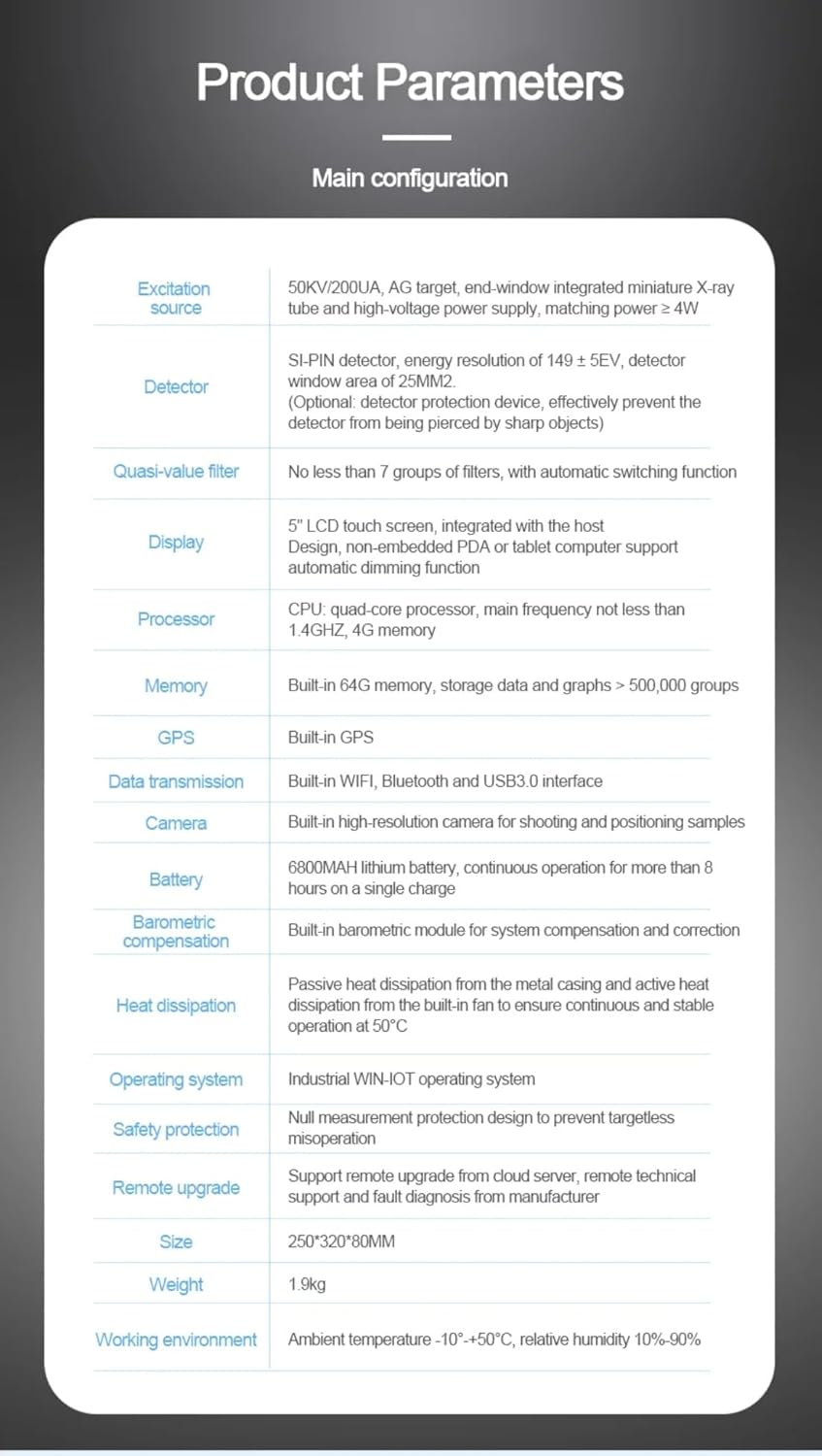 - SMART OPERATING SYSTEM WITH REAL-TIME DATA SYNC – Powered by an Android-based smart system, this XRF analyzer allows you to operate the device remotely and sync data in real-time with your mobile devices. It supports spectrum analysis, report generation, and instant data sharing via email, enhancing your workflow and making fieldwork easier than ever before.