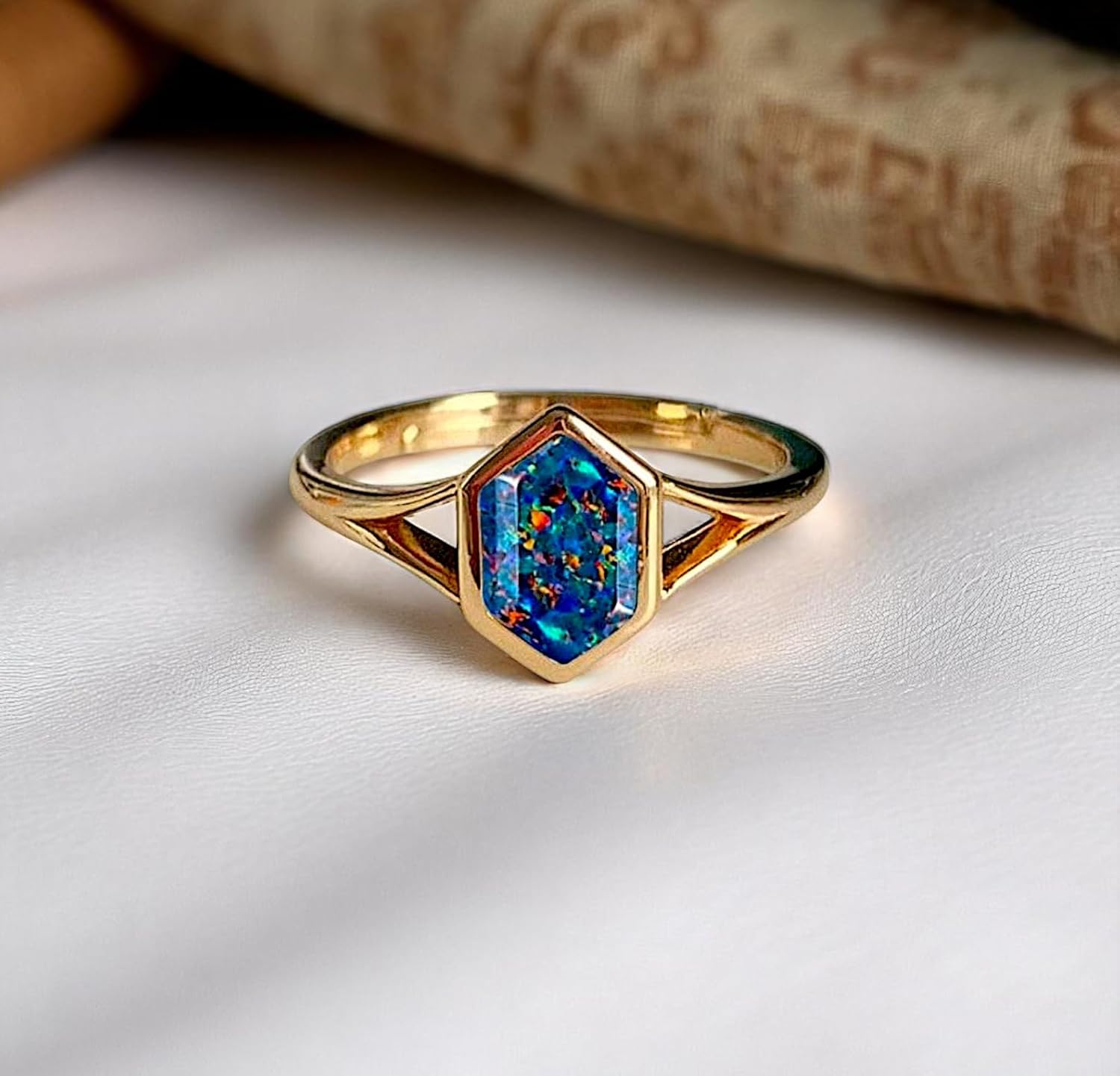 Hexagon Black Fire Opal Engagement Ring Bezel Setting Hexagon Cut Wedding Ring October Birthstone Ring Opal Anniversary Ring Gift For Women *Main Stone: Opal *Main Stone Creations: lab Created *Main Stone Size: 9x5 mm *Main Stone Color: Black *Main Stone Shape: Hexagon *Birthstone Month: October *Secondary Stone : Amethyst *Secondary Stone Shape: Round *Secondary Stone Color: Purple *Secondary Stone Size : 2mm