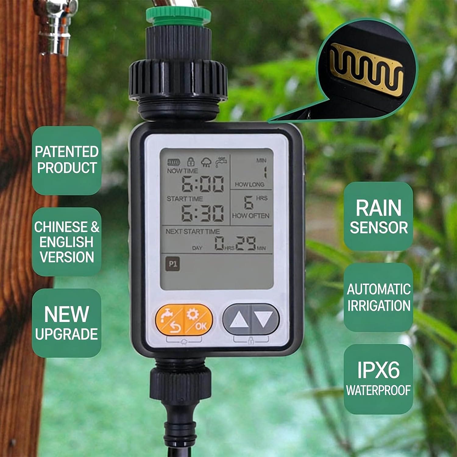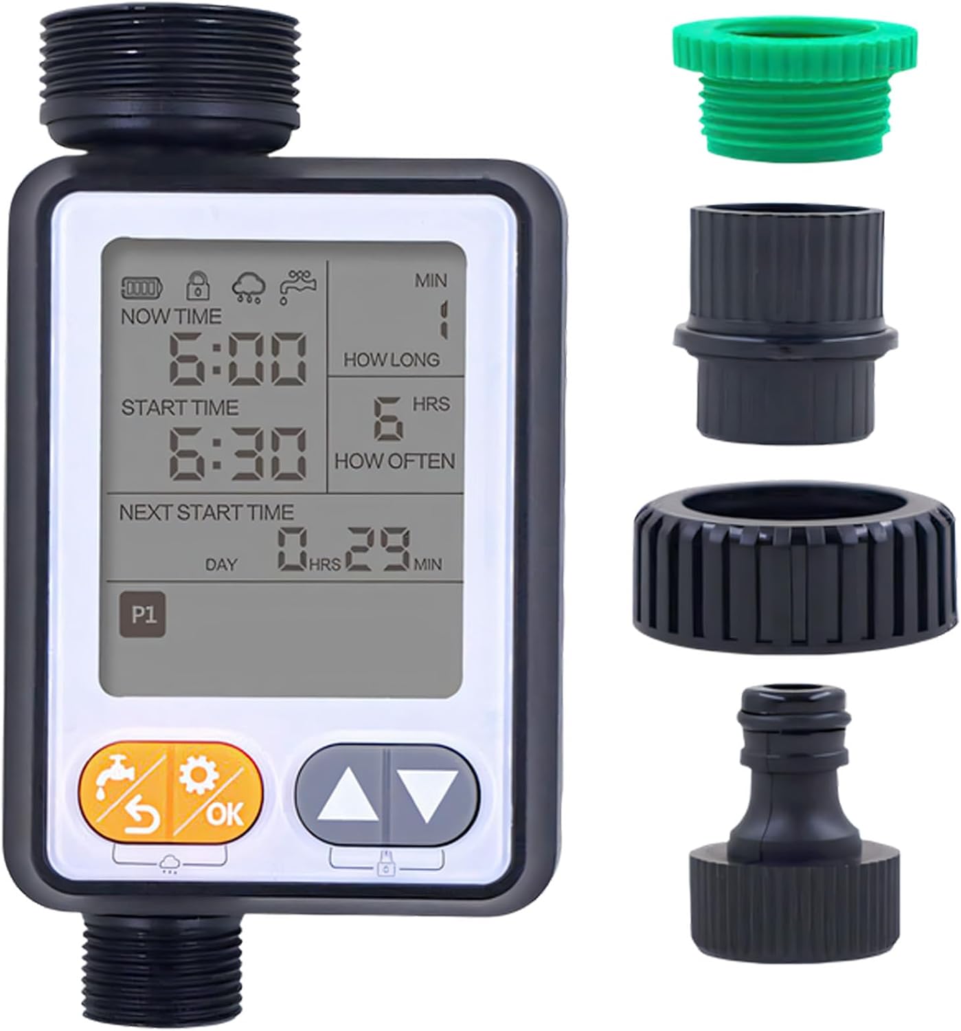 Impermeable Timer For Gardens With Adjustable Cycle From 1 Hour To 32 Days Features: Programmable Watering Control: This garden timer allows customized irrigation settings from 1 minutes, with adjustable cycles ranging from 1 hour to 32 days, accommodating plant watering needs Weather Responsive Function: Built in weather detection technology automatically pauses watering for 24 / 48 hours during wet conditions, improving water conservation by 40% against basic models while allowing manual watering when preferred Robust Construction: Made with water components including a sealed battery compartment and reinforced hose connector, designed to withstand varying water pressure from 7.25 to 116 units for dependable outdoor use in garden setups Clear LCD Display: Features a bright 3.3 inch backlit screen showing watering duration, frequency, remaining battery life, and more Versatile Application: Works well for gardens, lawns, greenhouses, pool filling, and pet watering systems Specifications: Substance: Working potential: 1.5VAAx2 Watering time: 1 second23 hours Watering interval: 1 hour31 days grade: IP54 Working water pressure: 0.5-8kg Rain feeling: automatically shuts off watering when it rains Screen: touch 720p screen: 720p LCD backlight display Multiple groups of programs: 10 groups of unattached programs Product size: 155x55x85mm Product net weight: 363 grams Applicable batteries: 2 AA batteries ( not included) Package Includes: Garden hose sprinkler timerx1 Note: Pay attention to the storage methods You need to purchase two AA batteries by yourself
