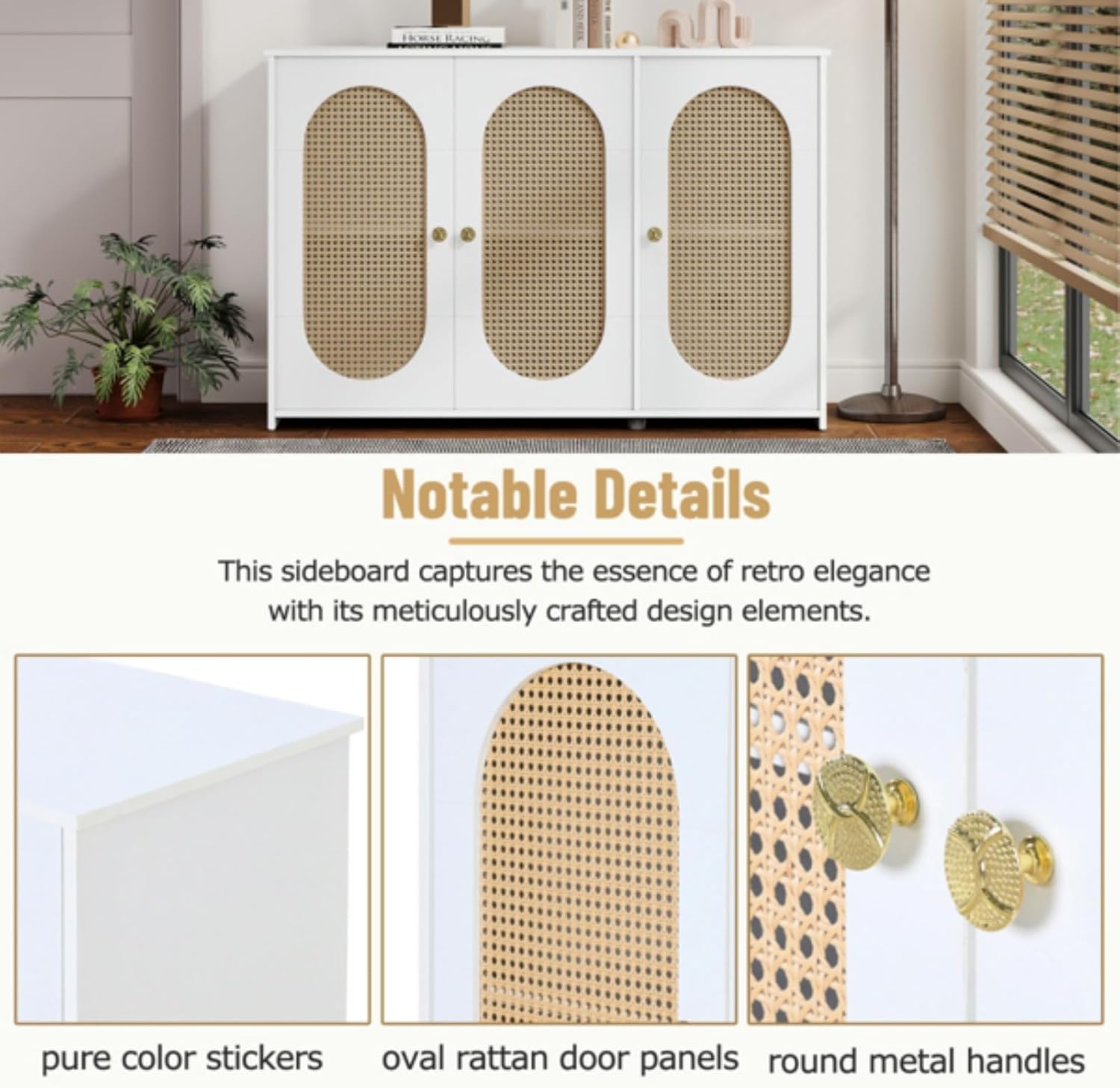 Color: White Assembled Length (inches): 48.8 Assembled Width (inches): 15.7 Assembled Height (inches): 32.3 This three-door vintage sideboard is a masterpiece that perfectly blends classic charm with ultimate functionality. Its elegant structure is made of high-quality materials, and its sophisticated design combines stability and storage functions. It can easily blend into your home décor, providing a unique aesthetic that stands out in any room.