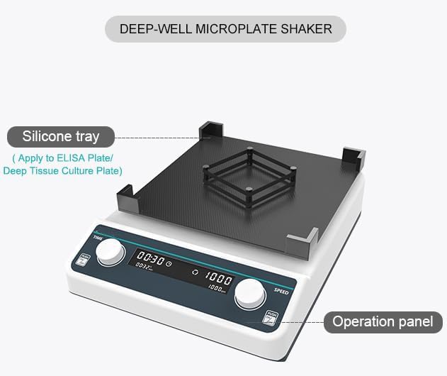 Features: Digital display for timing and speed. Timing and speed control:adjustable speed1500-3000rpm,timing range 1min-8h. Max processable sample:ELISA Plate / Tissue Culture Plate*4. Silicone tray. Specifiction: Motor:Brushless Motor Horizontal gyration amplitude:3mm RPM range:500-1200rpm RPM increment:10rpm Timing range:1min-8h Handling range:ELISA Plate / Deep Tissue Culture Plate*4 Power:20W Voltage: AC 110-220V Dimension(MM):355*260*105mm