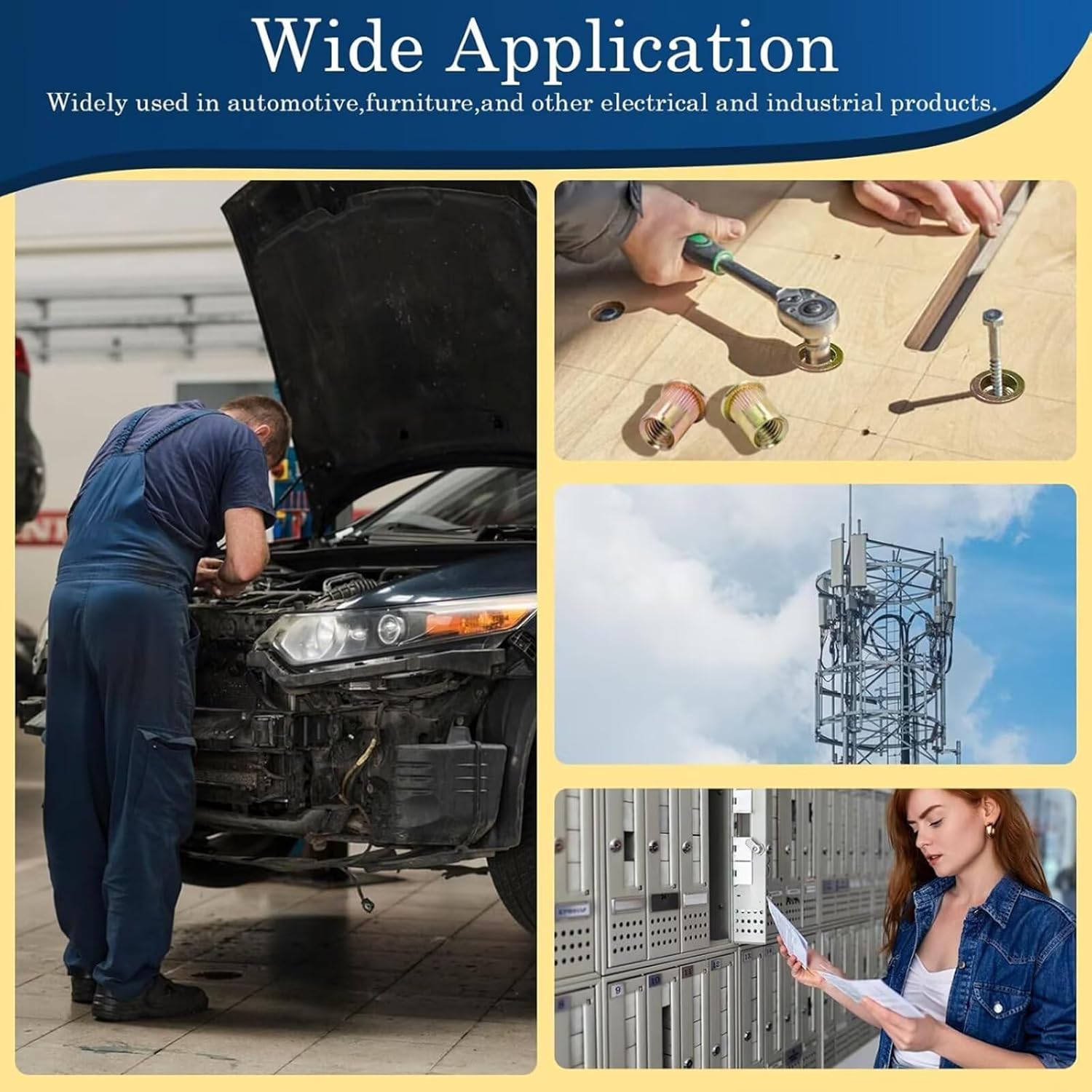 Why you need a Rivet Nut? Typically a rivnut is a threaded insert that can be compared somewhat to a rivet in function. They are made to fit tightly into a drilled or punched hole through thin metal, and when using the proper tool a portion of the corrugated area on the outside barrel of the rivnut expands and collapses to lock itself into the hole becoming a captured nut for a bolt to be screwed into. A rivet nut,also know as a blind rivet nut,is a one-piece internally threaded and counterbored tubular rivet that can be anchored entirely from one side. It is a kind of threaded insert. Rivet Nuts Drill a hole according to the size of the rivet nut installation hole,insert the rivet nut,and tighten the locking nut with the rivet tool. To rotate the knob counterclockwise can exit riveter after riveting Close handles Close the handles and rivet the nut in place. Multi-Grip Rivet Nuts Easy to use: Drill a suitable hole according to the size, then insert the pre-bulbed rivet nut and tighten the locking nut with the rivet tool. Application: Rivet nuts can be firmly fixed on thin sheet metal to provide tight screw locking force, such as sheet metal or non-metallic materials, plastics, wood, etc. Widely used in industry, construction, furniture, electrical appliances, equipment, and so on. Feature: A Rivet Nut fastener is a tubular rivet with internal threads. The material is too thin to machine the thread. It requires a tool or device to install in seconds from one side of the work. The added benefit of not only being a dependable fastener, but they are also ready to use with clean threads available for screw attachments. Blind Rivet Nuts also are used when an application has little or no access to the backside as they can be installed from the front side of the workpiece. 6 Size Rivet Nuts for choosing M3,M4,M5,M8,M10,M12