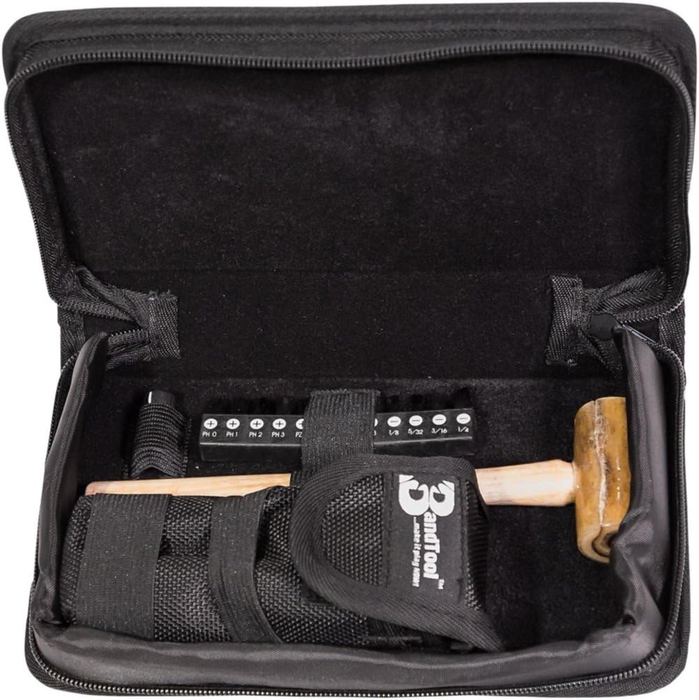 The BandTool is a portable repair tool designed for Band Directors, musicians, repair techs, and music stores. It's a multi-tool with 28 functions, including a driver set and a rawhide mallet. Its purpose is to facilitate emergency repairs at events like ball games, parades, competitions, or practice, ensuring instrumentalists can still perform.
