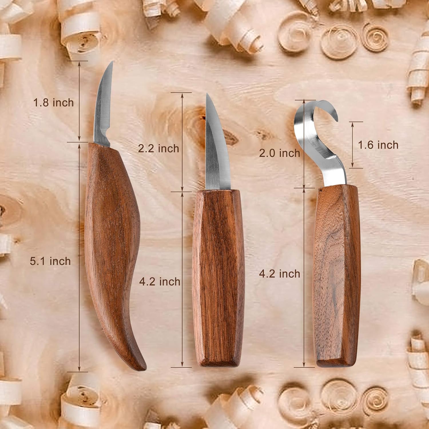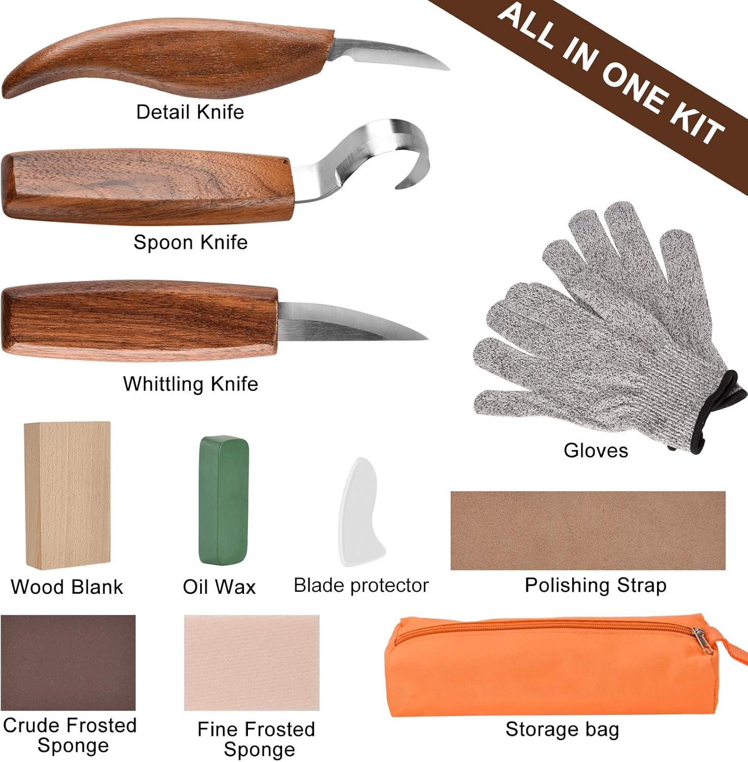 Wood carving tools, a perfect gift for beginners and professional woodcarver Features: ❤ A Spoon Blank- a beginner is easy to carve a spoon with our knives to start his carving life. ❤ Wood Carving Hook Knife-Designed specifically for wood spoon carving, carving bowl, cup, kuksa of different sizes and round edges. ❤ Wood Chip Carving Knife-Designed for delicate wood cutting and really small details, keep your woodwork to perfection. ❤ Wood Carving Sloyd Knife-Designed for wood carving, green woodworking, whittling and roughing wood out. ❤ Good Helpers Of Knives-Specially equipped with a leather strop, whetstone, frosted sponge and a polishing compound in the tools set Which can prevent from rusting, making it glossier and sharper. Usage Step 1.Use Hook Knife Caving Spoon Concave. 2.Use Whittling Knife to Carve Spoon Prototype. 3.Use Detail Knife to Finish Carving. 4.Polishing Spoon Surface. Suggestion: 1.Children should wear safety gloves and guided by an adult. 2.Use a carving glove on the hand you're holding the piece of wood with.