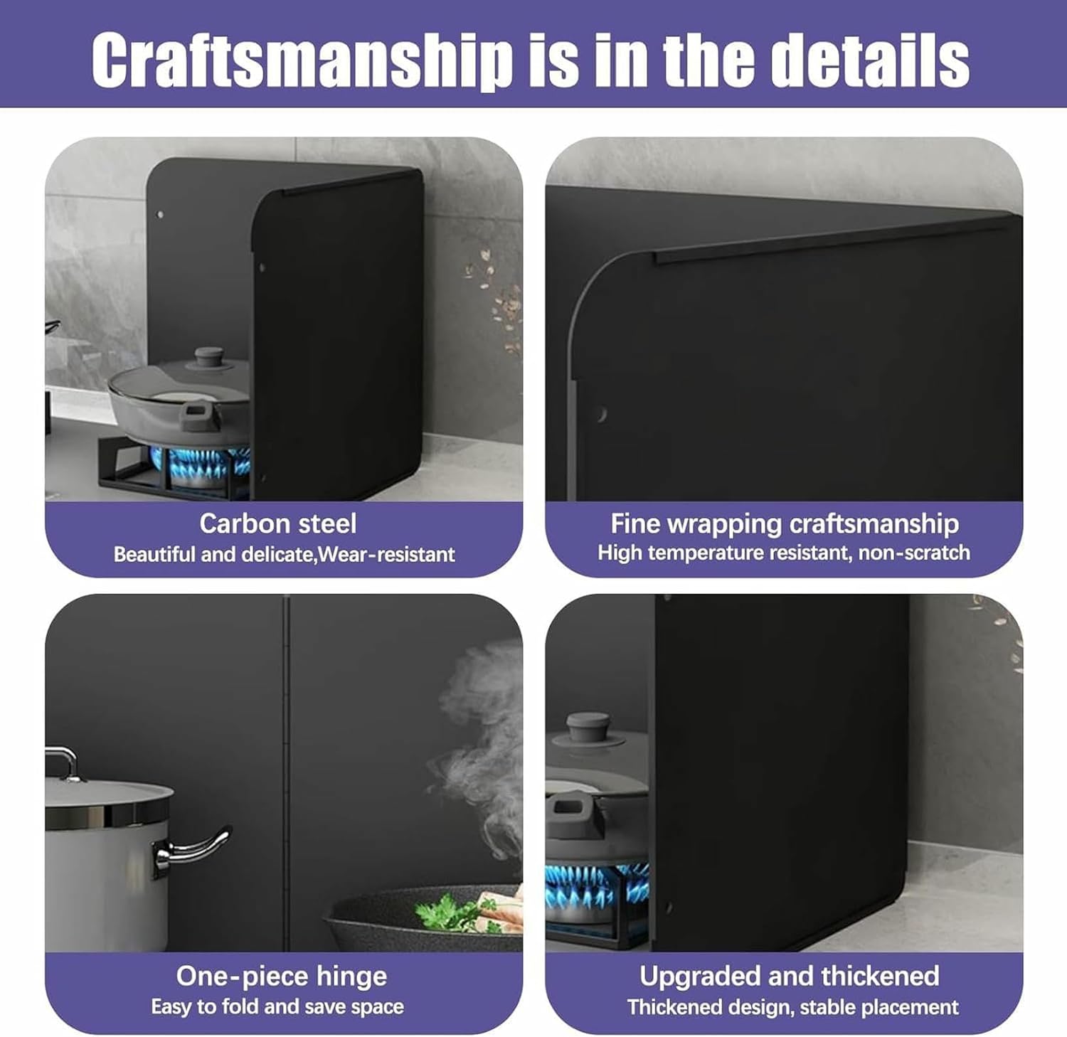 Prevent Oil Splash: the splatter guards for frying can prevent the stove and its surroundings from oil or food spills when cooking in the kitchen; They are well insulated to prevent surrounding plastics, spices, cans, etc. from being heated or deformed; You can also use them as food wash splash guardsName: Hot-dip galvanized oil barrierThickness: 0.6mmMaterial: Selected carbon steelStyle: two-piece fold, three-piece fold, four-piece foldTwo-piece folded size: ①30cm×30cm, ②30cm×40cm, ③35cm×40cm,④40cm×40cm, ⑤50cm×50cmThree-piece fold size: ① 30cm high × 40cm deep × 40cm wide, ② 40cm high × 40cm deep × 40cm wide,③Height 45cm×Depth 45cm×Width 45cm, ④Height 50cm×Depth 50cm×Width 50cmFour-piece folded dimensions: ① 30cm high × 40cm deep × 80cm wide, ② 35cm high × 40cm deep × 80cm wide,③H40cm×D40cm×W80cm, ④H45cm×D45cm×W90cm,⑤ 50cm high × 45cm deep × 90cm wide, ⑥ 60cm high × 45cm deep × 90cm wideColor: blackFeatures: Suitable for users of various house types, safe and hygienic▶ Notes:★About size---Due to different measurement methods, there may be an error of 1~3cm, please understand!★About service---If you have any questions, please feel free to contact us, we will reply you within 24 hours.
