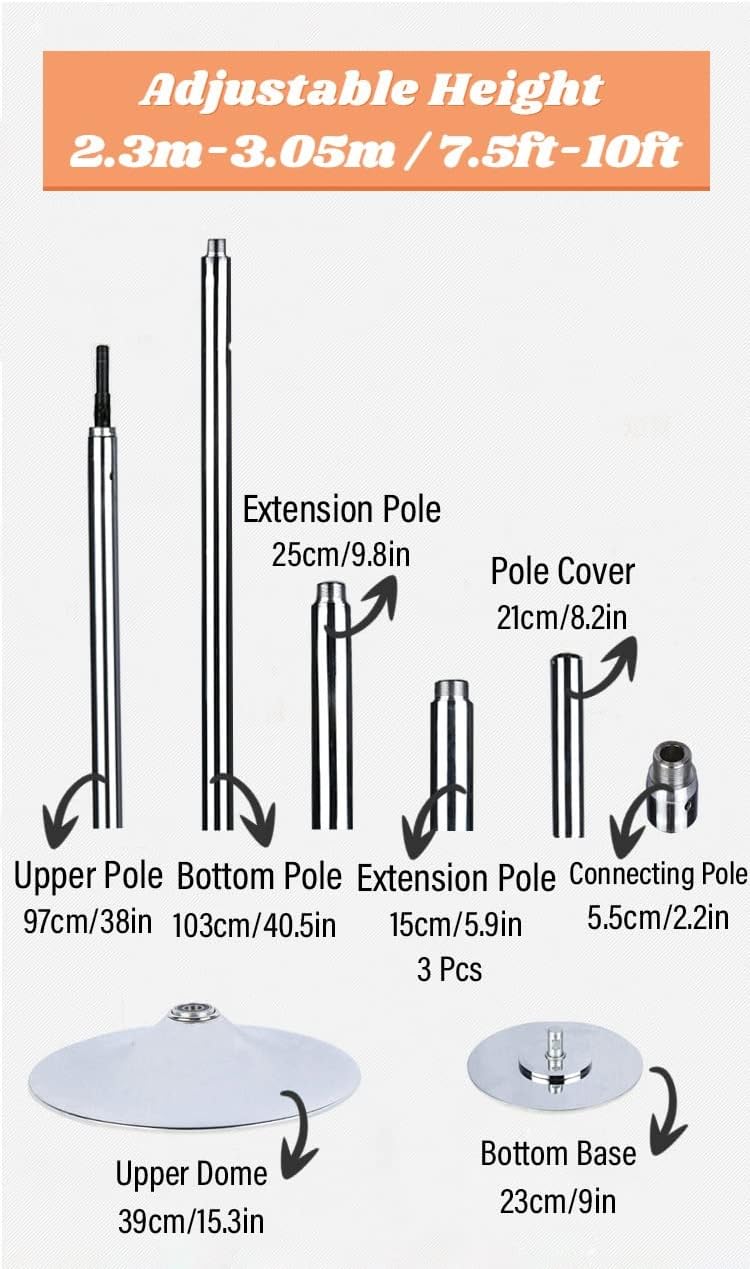 Ceiling Mounting Pole Commercial Permanent Dance for Pub Gym Club Yoga Room,Product Features: 1. Constructed from durable metal, this pole features a 45mm diameter that can be extended to your desired height. 2. Boasts a high-grade electroplated chrome finish for a sleek and stylish look. 3. Features screw-together tube joints with high precision, providing maximum strength, stability, and smoothness with almost seamless connections. 4. Equipped with a double-width pole support dome that evenly distributes load and pressure on the ceiling, supporting weights of up to 200kg. 5. Fully removable and portable for convenient transportation and storage. 6. Can be used in stationary or spinning mode by simply tightening or loosening the bottom screws. Package Includes: 1 x Main pole 1 x Adjustable cover 1 x Bottom base 1 x Upper dome 1 x Set of installation tools