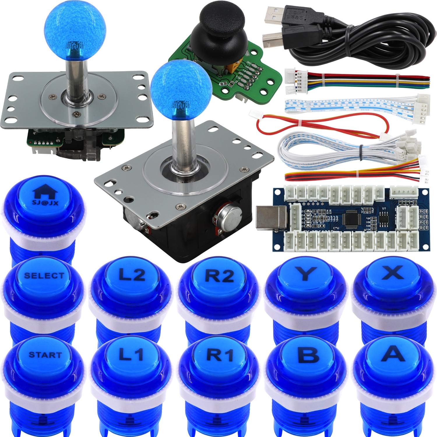 Package Includes: 1 x 1125 Encoder Board 1 x USB Cable 1 x 5Pin Joystick 1 x 5pin Cable for Joystick 1 x 3D Joystick 1 x 3D Mushroom Head 1 x 6Pin Cable for Mushroom Head 1 x 4Pin LED Button 1 x 4Pin Cable for Button 10 x 28mm LED Buttons 10 x 3Pin Cables for LED Button