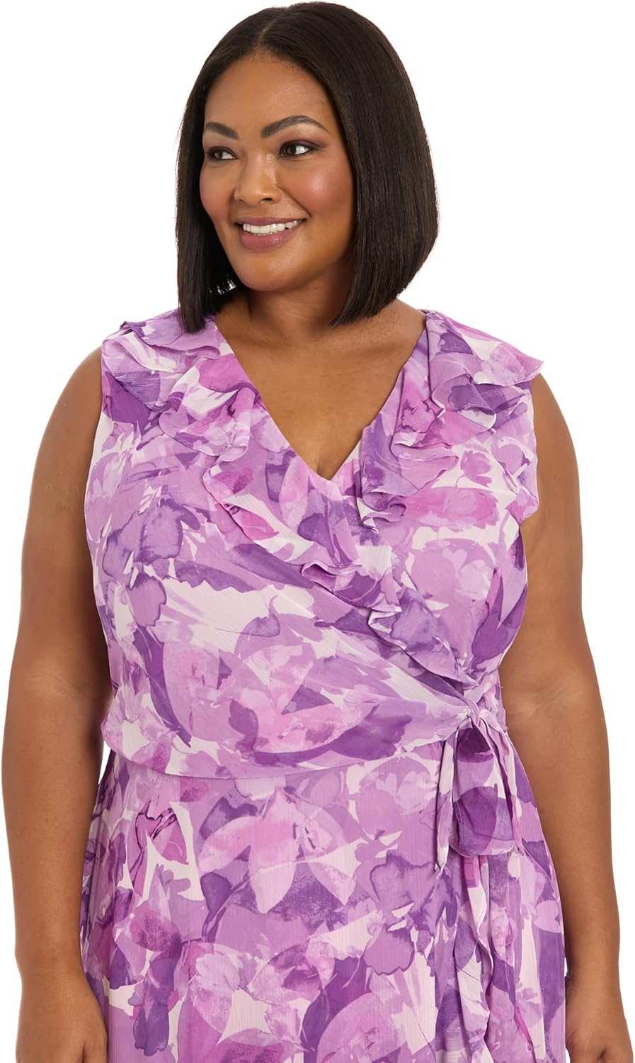 This sophisticated midi dress, wrap dress, and wedding guest dress features elegant ruffle detail along v-neckline flowing into cascading side ruffle, with tie waist, fitted bodice, and asymmetrical hem with ruffle trim in lightweight fabric