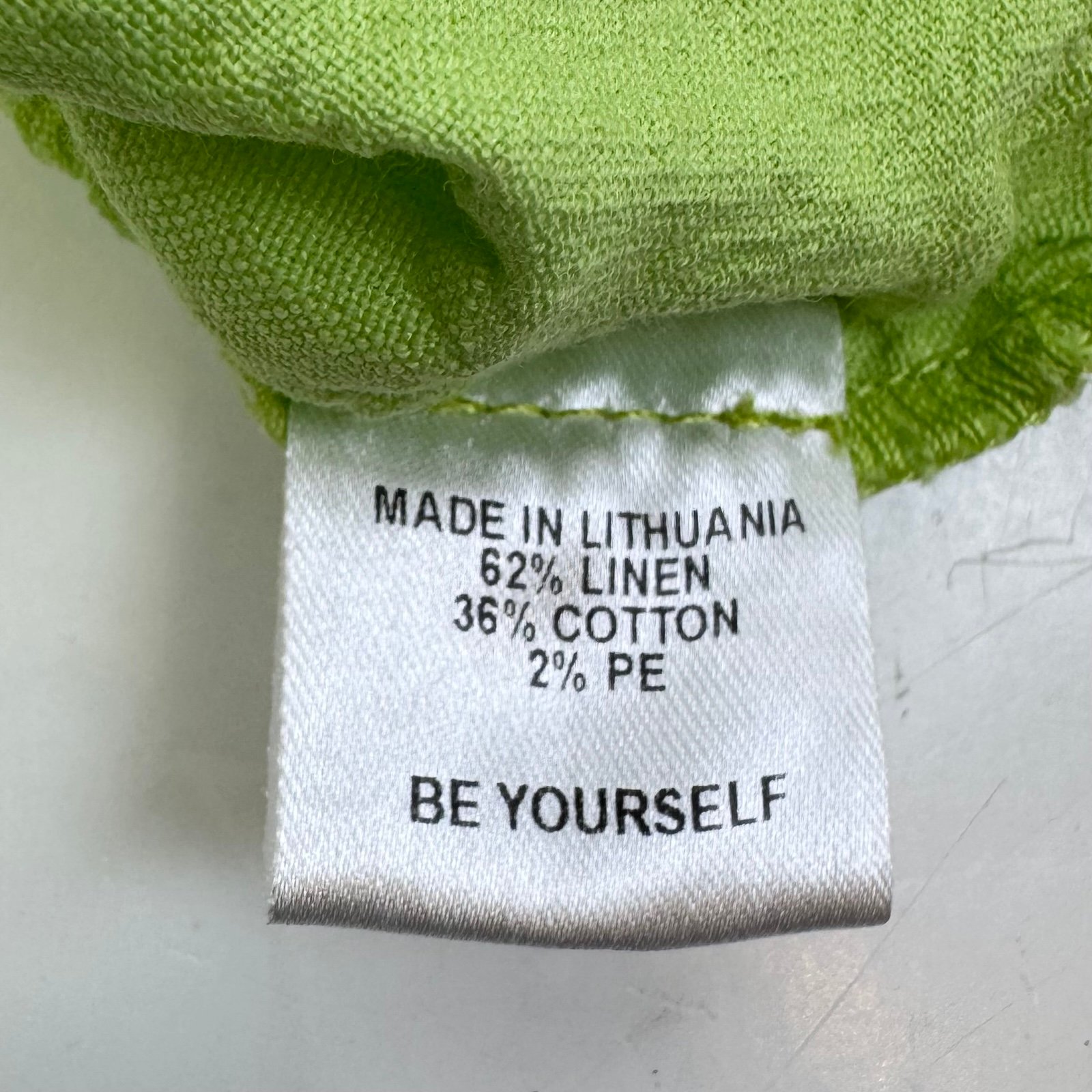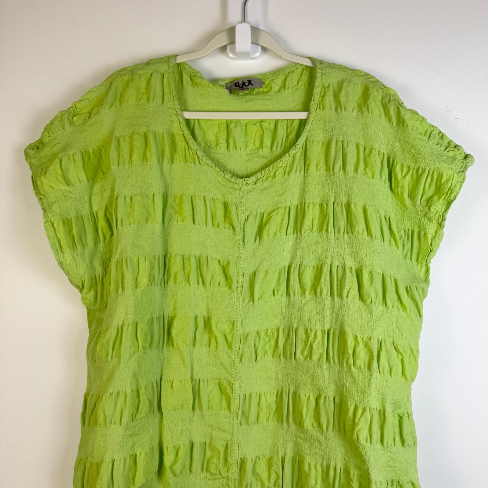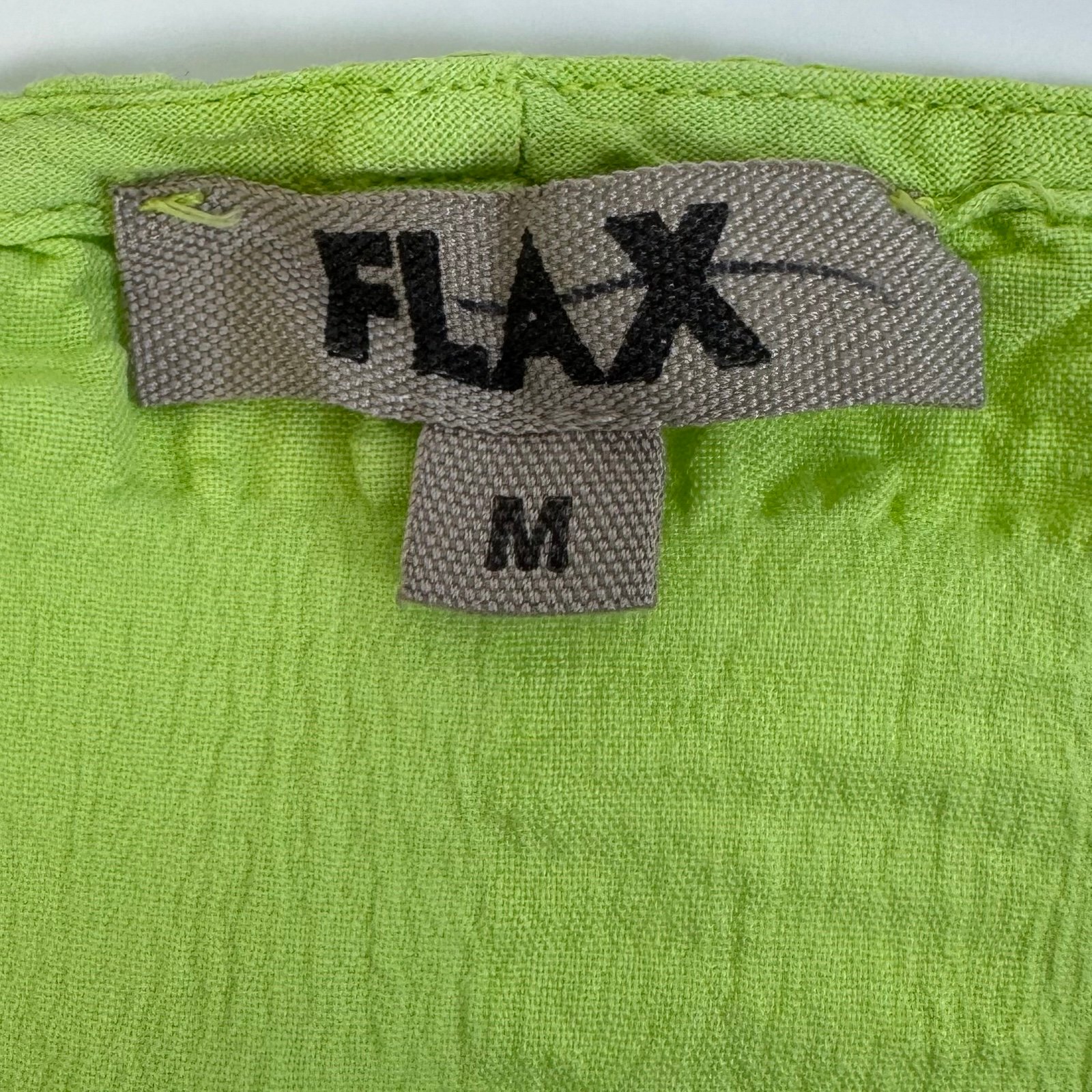 FLAX oversized short sleeve tunic shirt top in size medium, made from a breathable blend of 62% linen, 36% cotton, and 2% PE. Features a textured crinkle design, relaxed fit silhouette, and vibrant chartreuse lime green color. Lightweight and airy natural fabric makes it perfect for spring and summer wear. Effortlessly combines comfort and style with a minimalist, artsy, lagentlook, linencore aesthetic. Ideal for casual everyday outfits, resort wear, travel, or layering with linen pants and skirts. High quality and timeless design typical of FLAX pieces. In excellent preowned condition with no flaws noted.