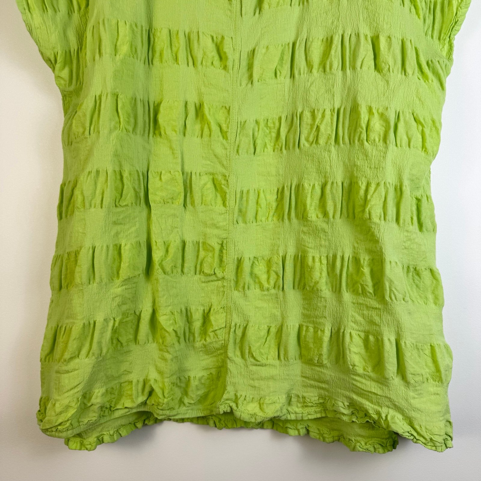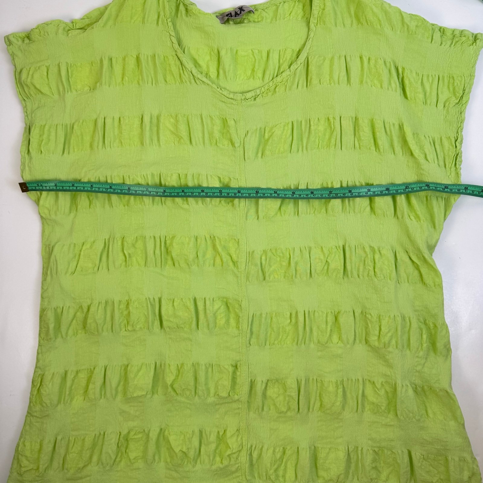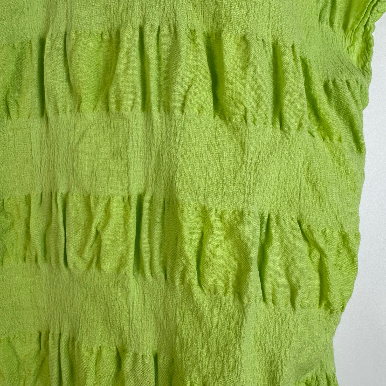 FLAX oversized short sleeve tunic shirt top in size medium, made from a breathable blend of 62% linen, 36% cotton, and 2% PE. Features a textured crinkle design, relaxed fit silhouette, and vibrant chartreuse lime green color. Lightweight and airy natural fabric makes it perfect for spring and summer wear. Effortlessly combines comfort and style with a minimalist, artsy, lagentlook, linencore aesthetic. Ideal for casual everyday outfits, resort wear, travel, or layering with linen pants and skirts. High quality and timeless design typical of FLAX pieces. In excellent preowned condition with no flaws noted.