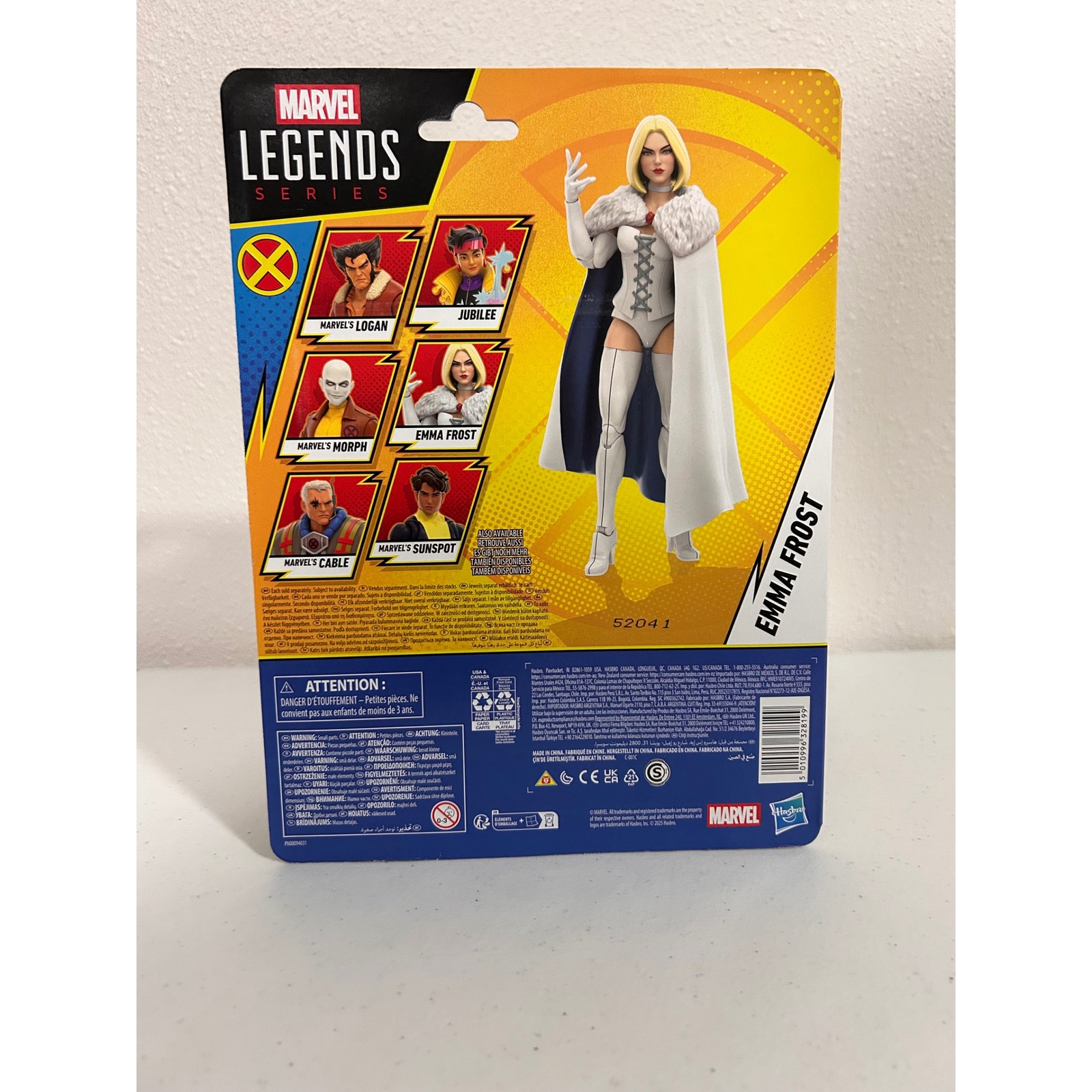 New in package, Marvel Legends Emma Frost action figure from the X-Men 97 series. This collectible figure is designed with multiple points of articulation, features an alternate head and pair of hands, and is a great addition to any Marvel collection. The packaging showcases the iconic X-Men '97 branding, making it appealing to both collectors and fans of the animated series. The figure is secured in a clear plastic blister on a card featuring artwork of the character, ensuring its mint condition and visual appeal.